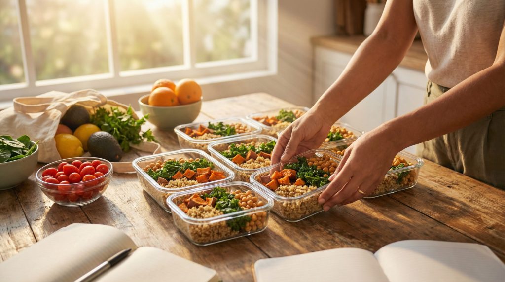 Preparar marmitas para a semana (o famoso meal prep) é a garantia de que o plano será seguido. Reserve 2 ou 3 horas do domingo para adiantar as bases: higienizar folhas, cozinhar grãos e deixar carnes marinando ou já prontas.