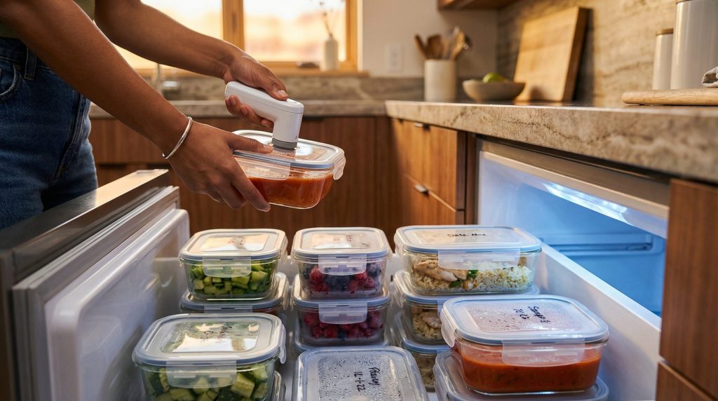 A forma como você guarda a comida é tão importante quanto o preparo. O porcionamento inteligente evita o recongelamento — prática perigosa que favorece o crescimento bacteriano — e facilita o dia a dia corrido.