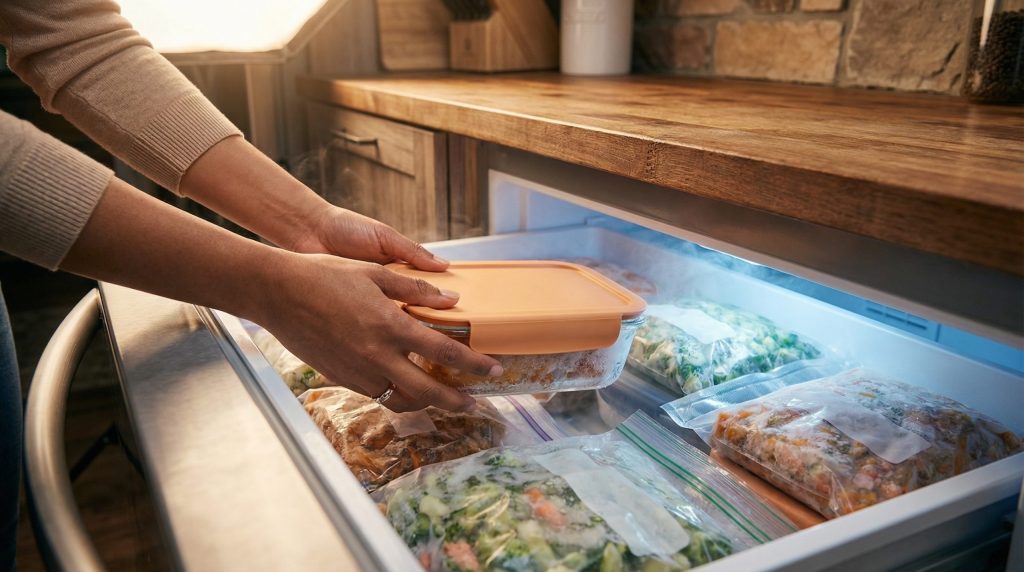 Um freezer bagunçado é um convite ao desperdício. Para otimizar o espaço, prefira recipientes quadrados ou retangulares, pois eles se encaixam melhor e não deixam “espaços mortos” como os potes redondos. Uma técnica excelente para quem tem pouco espaço é o congelamento em sacos herméticos (tipo ziplock).